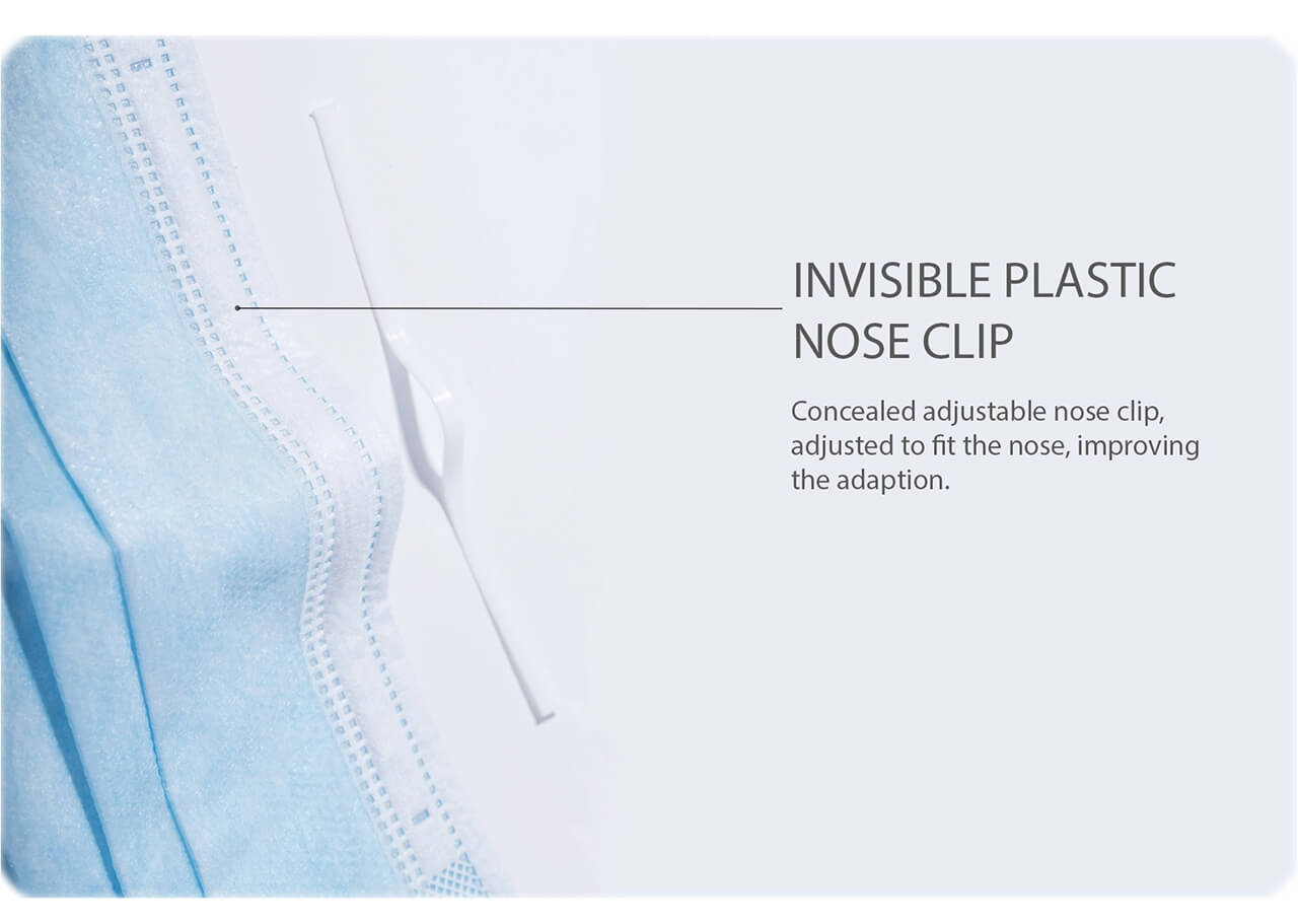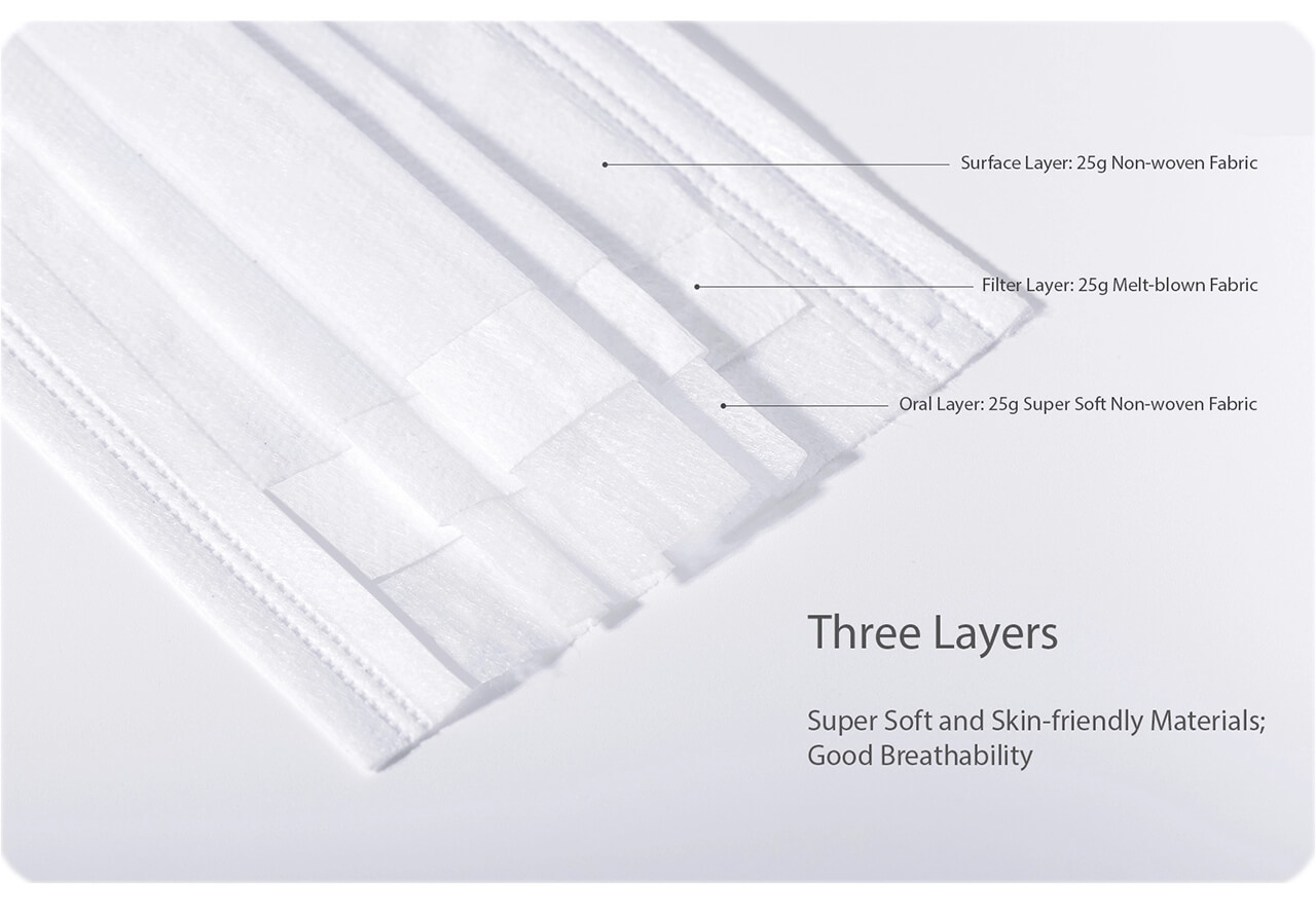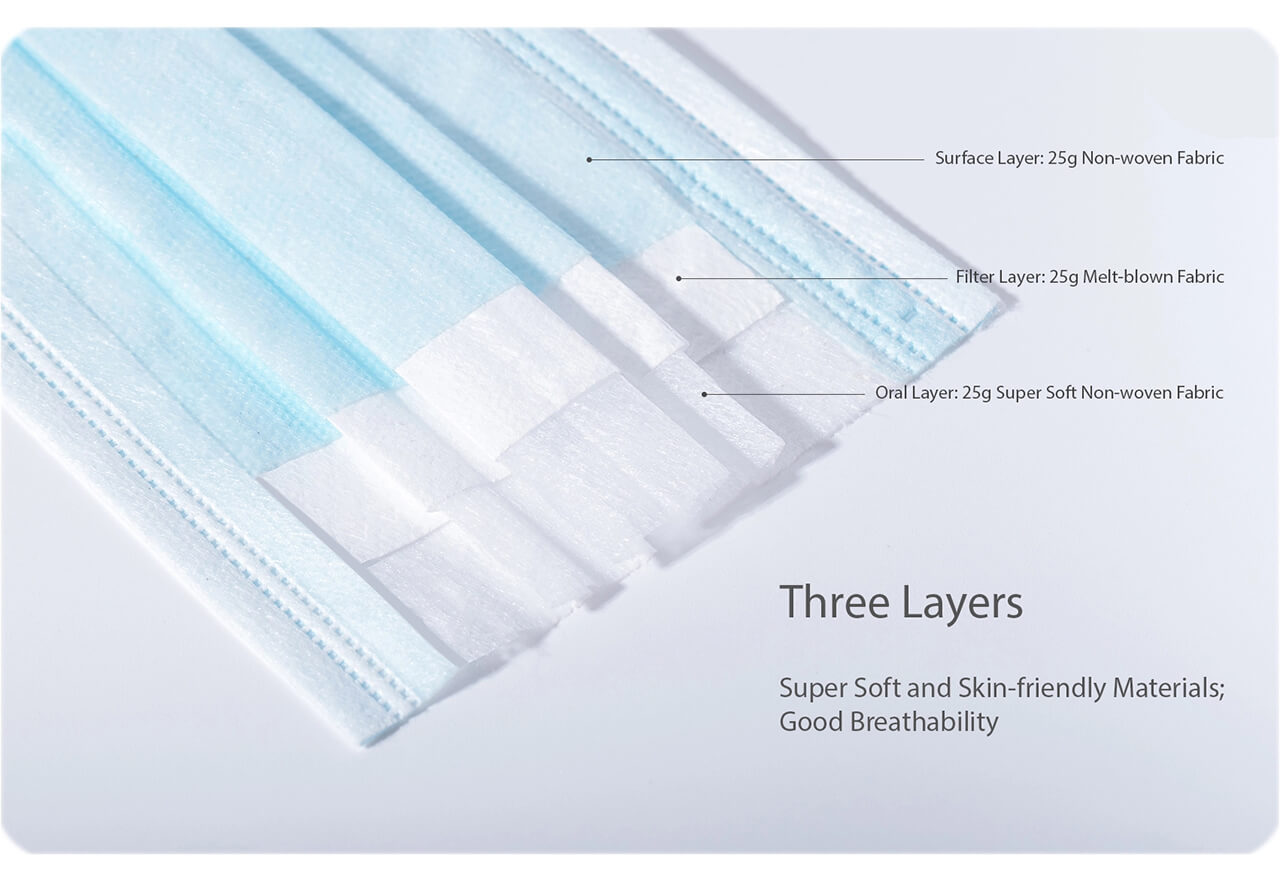 Produk ini terutamanya terdiri daripada fabrik bukan tenunan berbilang lapisan: lapisan luar dan lapisan mulut adalah fabrik bukan tenunan PP spun bond, dan bahagian tengahnya adalah fabrik bukan tenunan yang ditiup lebur dengan prestasi penapisan tinggi. Lapisan luar boleh didapati dalam warna biru, hijau, putih, hitam dan warna lain; Tali telinga lebar dan lembut. Jalur jambatan hidung diperbuat daripada bahan plastik dan sesuai dengan batang hidung.